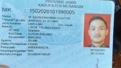 Newslan-id Merangin. Penemuan mayat laki laki di Danau Biru Pulau Layang, menurut informasi di KTP mayat itu orang Talang Kawo, bernama M Agung Rahman Guntur dengan tempat tanggal lahir Bangko 01 Januari 1999, alamat Lingkungan Talang Kawo RT 028 RW 009 Dusun Bangko kecamatan Bangko kabupaten Merangin Jambi.